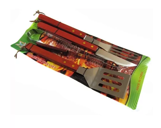 Набір для барбекю та гриля 4 предмети Інтернет магазин пропонує Вам Набори для барбекю та гриля - вірні помічники на відпочинку на природі для приготування різноманітних продуктів на грилі. За допомогою цього набору Ви зможете максимально контролювати весь процес приготування. Набір включає чотири найнеобхідніші і затребувані предмети - це лопатка, зручні щипці, вилка і ніж. Усі складові набору виконані з високоякісної нержавіючої сталі з дерев'яною ручкою і зуміють прослужити досить великий термін, вимагаючи мінімального стандартного догляду.